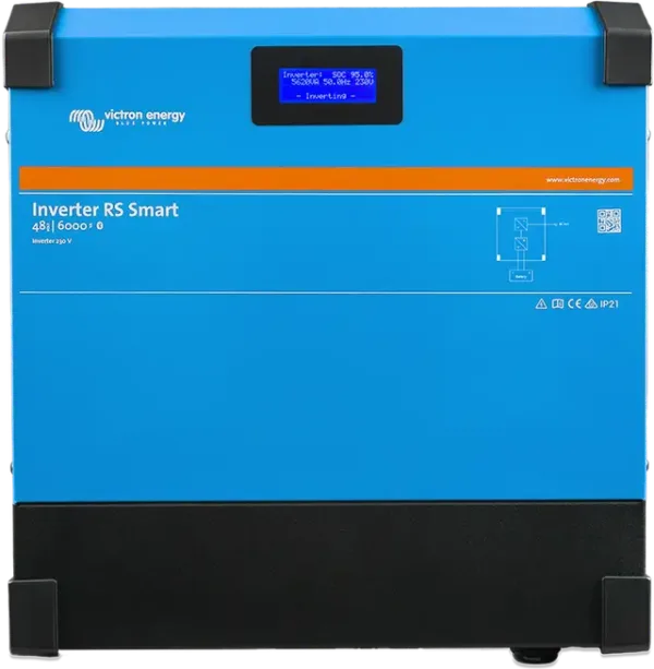 Falownik / Inverter RS 48/6000 230V Smart wyposażony jest w wyświetlacz umożliwiający odczyt bieżących danych akumulatora i falownika. Parametry te można również odczytać za pomocą aplikacji VictronConnect wykorzystującej łączność Bluetooth. Poza tym, falownik posiada port VE.Can, umożliwiający połączenie z urządzeniem z serii GX i monitorowanie systemu.