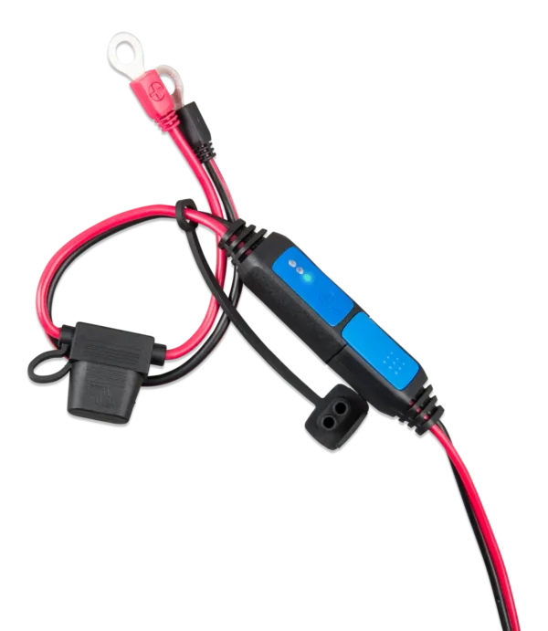 Wskaźnik akumulatora Battery Indicator Eyelet M8 z bezpiecznikiem 30A ATO. Umożliwia szybki i wygodny odczyt stanu naładowania baterii w ładowarkach Victron Blue Smart IP65. Idealny do instalacji PV i kamperów.